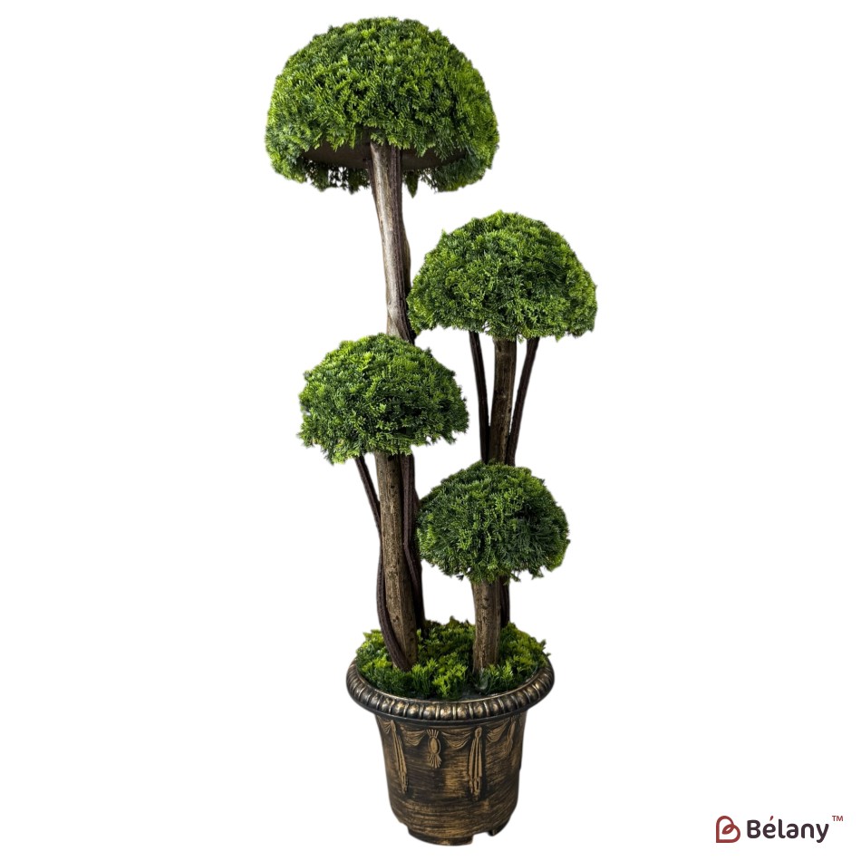 Brad decorativ artificial în ghiveci, stil bonsai, cu 4 coroane verzi – ornament de interior/exterior