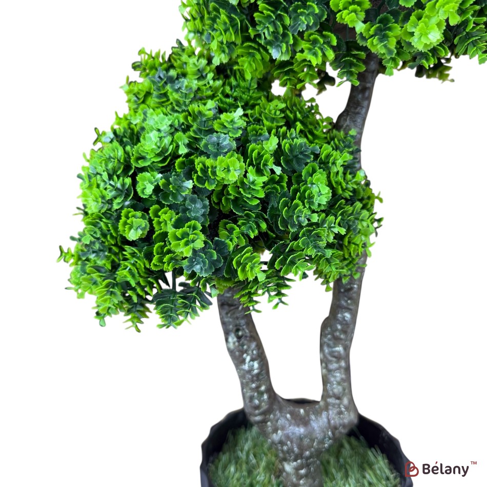 Copac decorativ artificial în ghiveci negru, cu frunziș verde bogat.